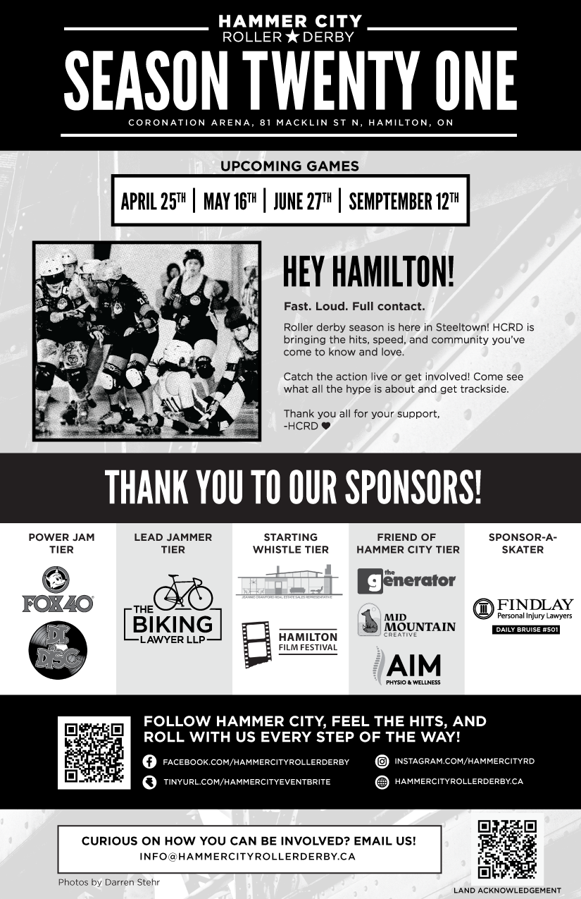 It is with the intent of commitment to collective responsibility, truth, and reconciliation that Hammer City Roller Derby gathers us here today and honours all Indigenous peoples who have served as keepers of this territory.